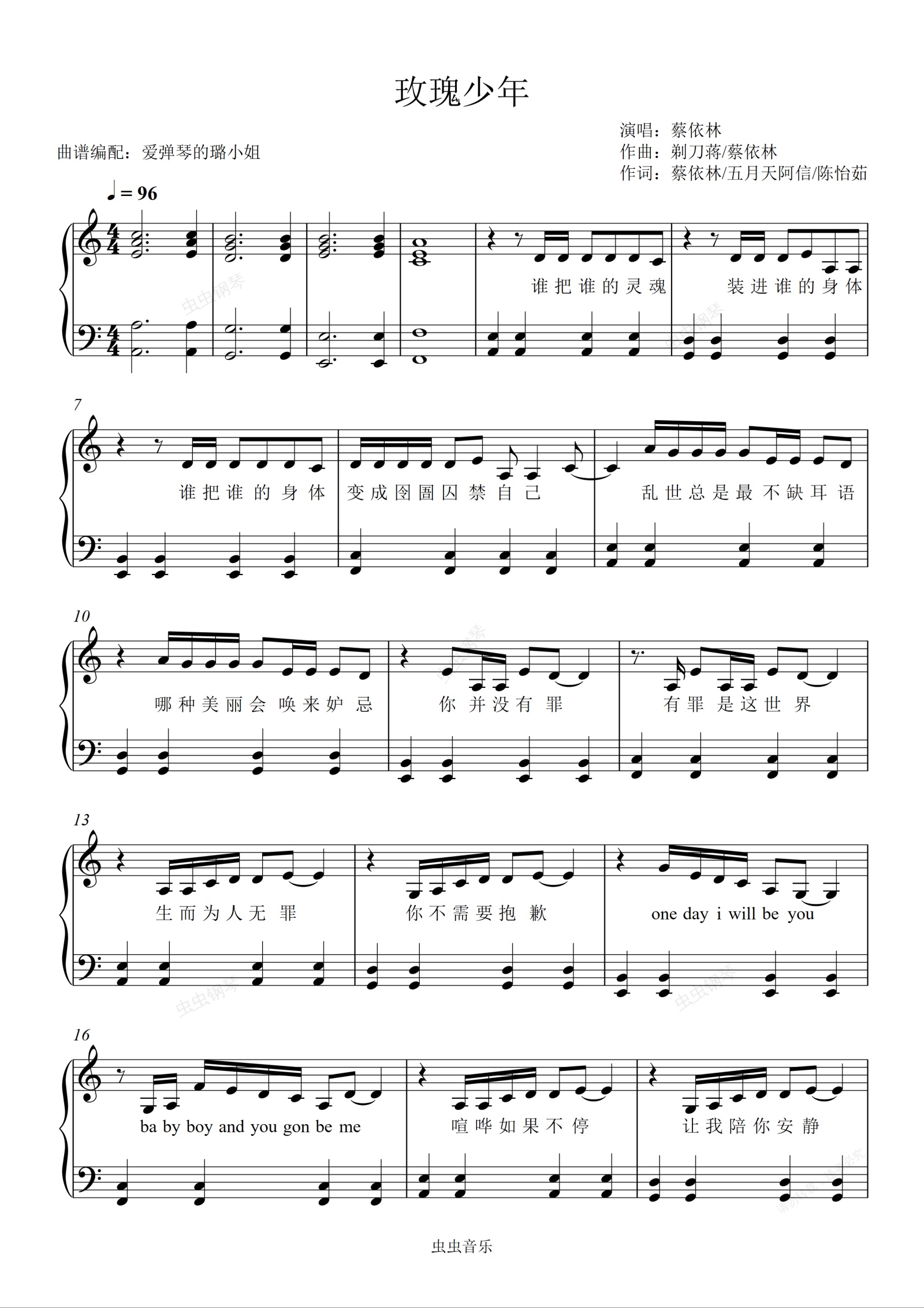 鋼琴譜:玫瑰少年-C調簡單版-附歌詞