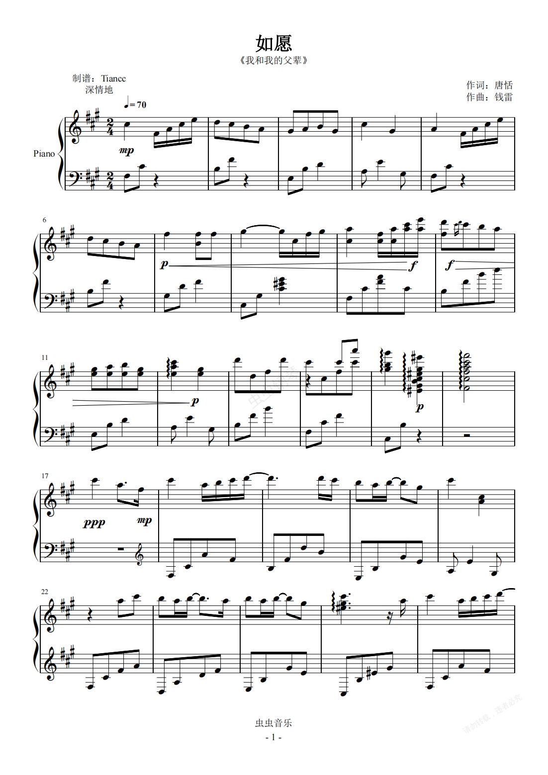 鋼琴譜:《如愿》王菲,完整完美演奏版!(我和我的父輩)299+難度