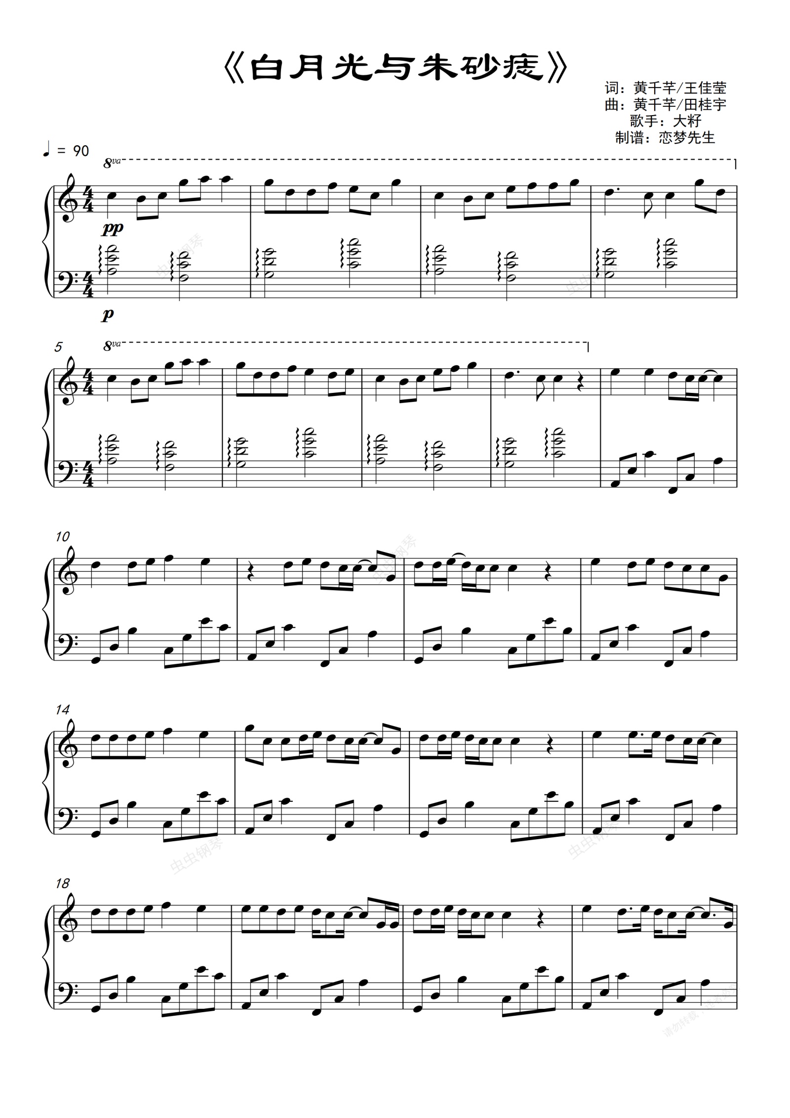 鋼琴譜:《白月光與朱砂痣》C調(diào)教學版