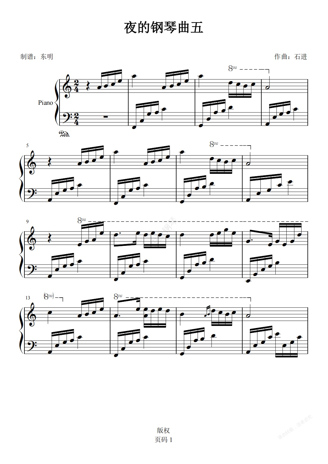 鋼琴譜:C調少加線版-夜的鋼琴曲五