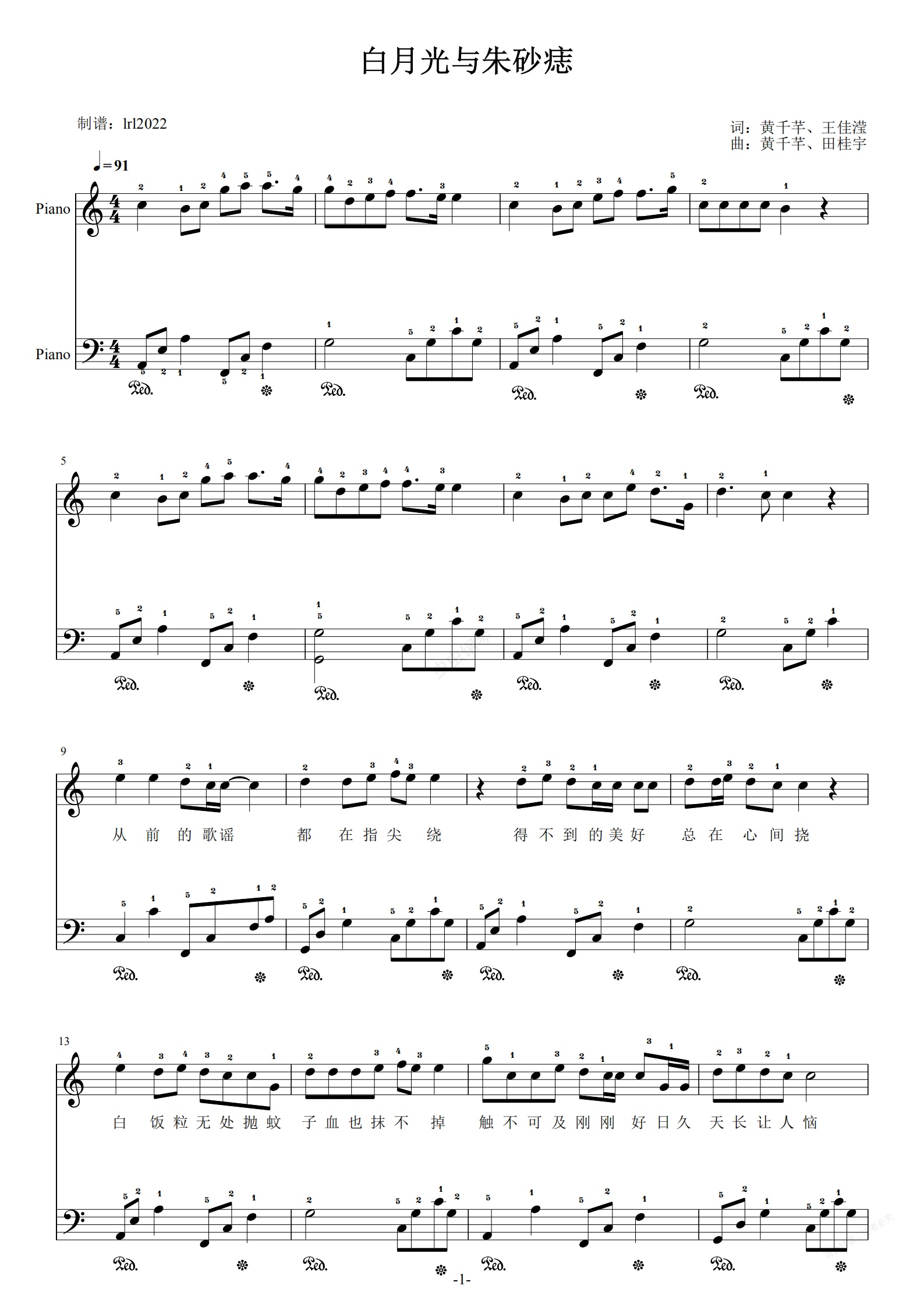 鋼琴譜:白月光與朱砂痣 C大調(diào)簡單版 指法+歌詞+踏板