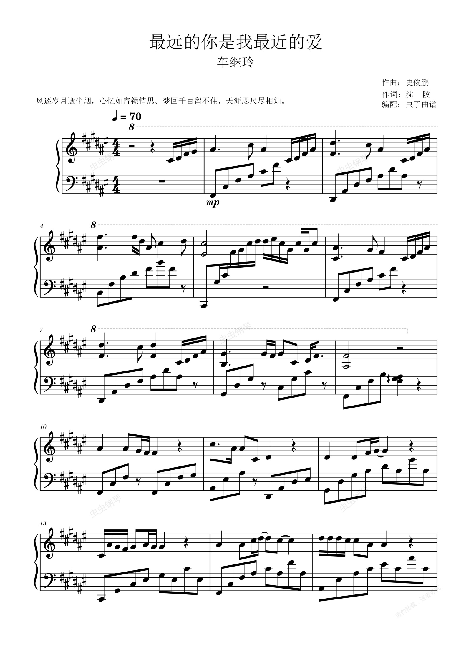 根據(jù)原曲走向精心編配,原調(diào)制譜,唯美抒情。麻煩喜歡的蟲友左下角點個小紅心,謝謝... 一直很喜歡這首歌,真的是唱出了內(nèi)心對愛的傾訴,最遠的你,是我最深的愛,最美的相遇,讓思念拉近我們的距離,不管見與不見,你始終在我心里,這份愛永遠不會變。今生無緣,愿來世遇見不要再錯過!