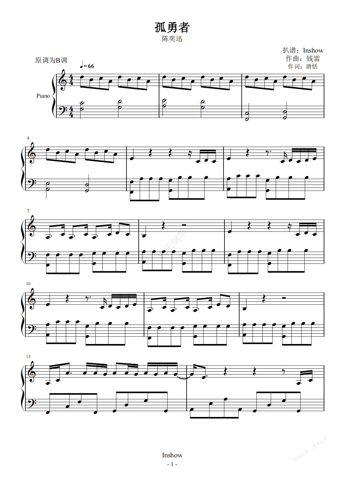 鋼琴譜:孤勇者【C調獨奏】- 陳奕迅 -(動畫《英雄聯盟:雙城之戰》中文主題曲)