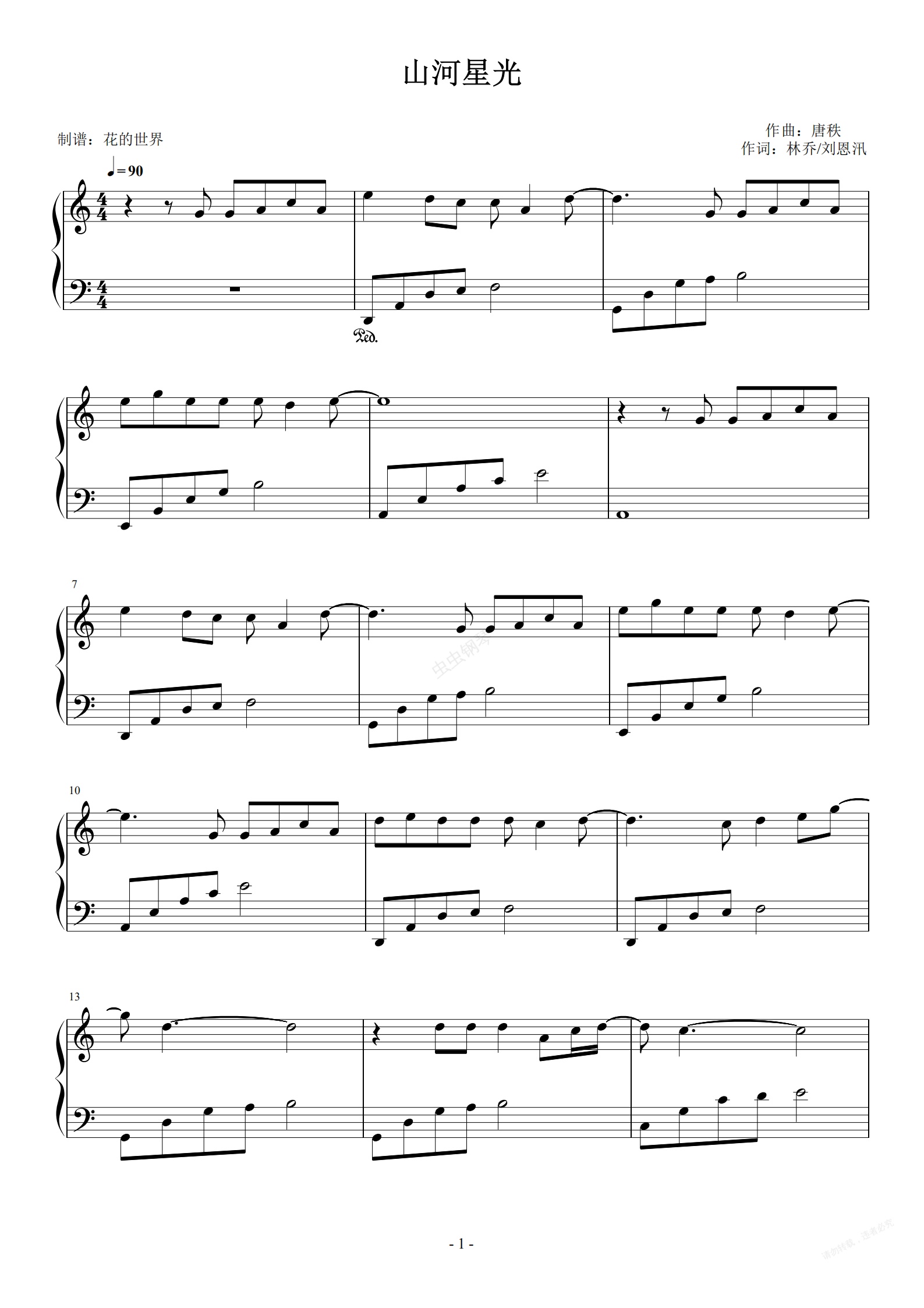 鋼琴譜:山河星光 C調(diào)簡易版 王一博