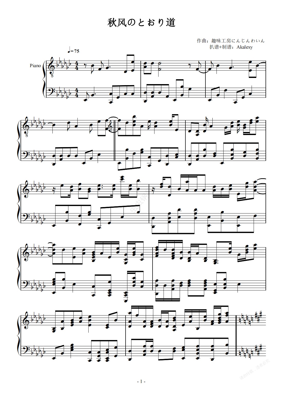 鋼琴譜:《秋風のとおり道》東方風神錄