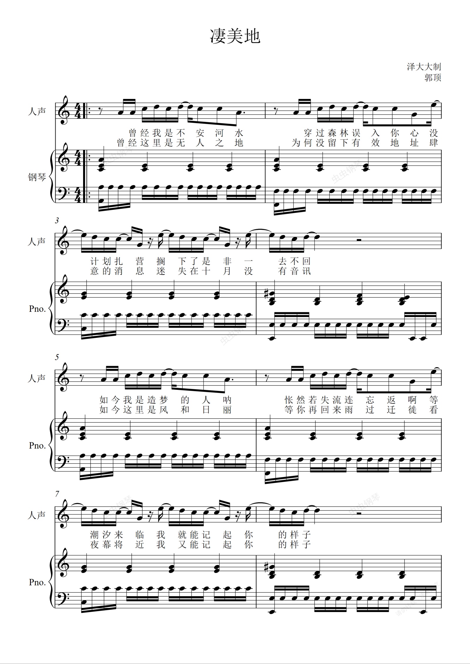 鋼琴譜:凄美地【女生a小調(diào)彈唱附詞】澤大大 郭頂