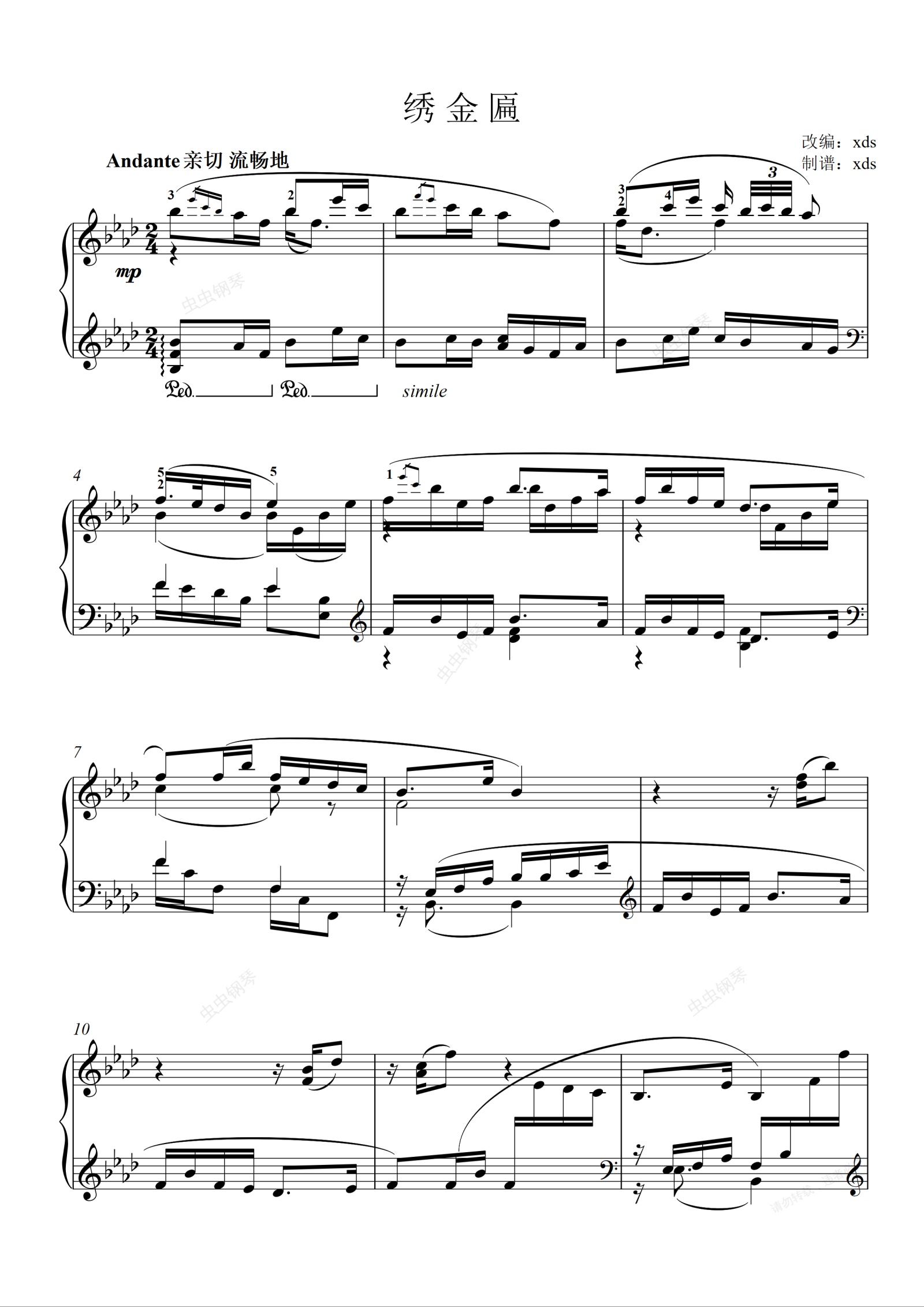 繡金匾A段旋律舒緩,模仿民族樂器古箏的“拔奏”演奏效果,使裝飾音明亮、流暢,具有濃郁的中國民族音樂風格。 B段情緒熱烈表達了對子弟兵的熱愛……