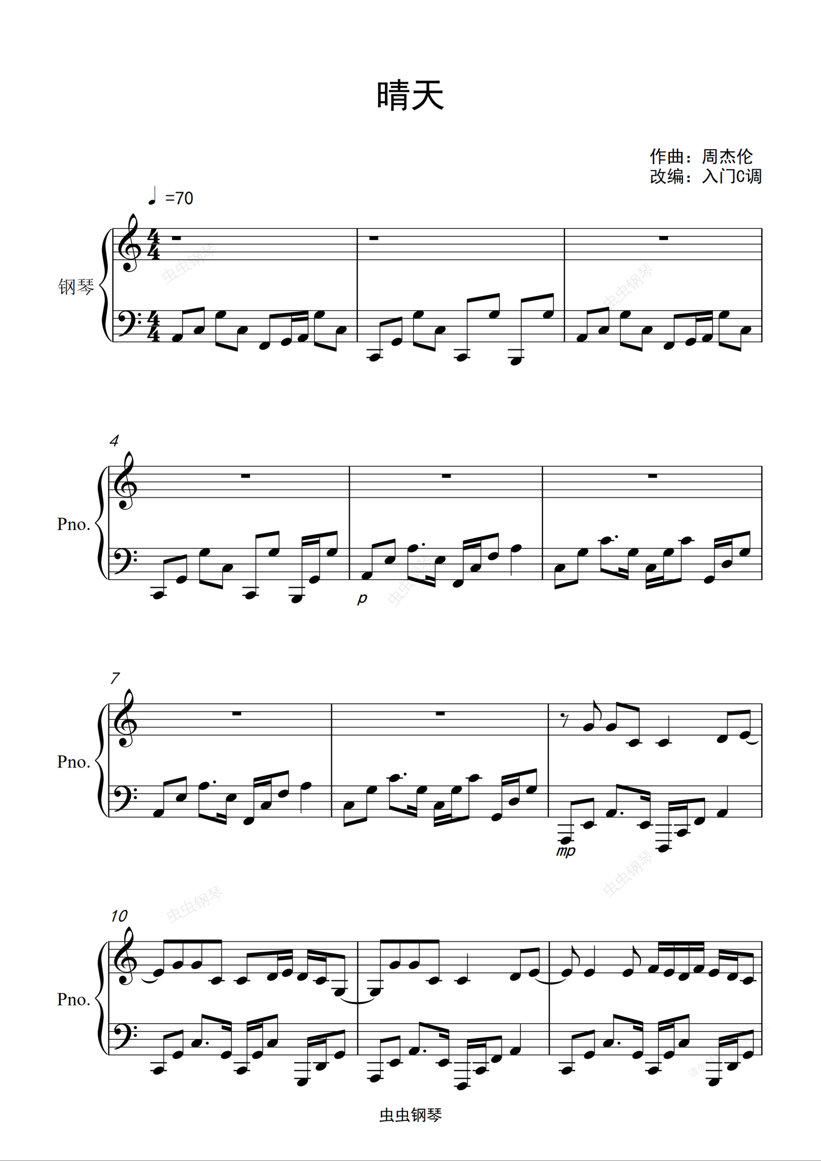 鋼琴譜:周杰倫《晴天》入門C調(diào)簡單版