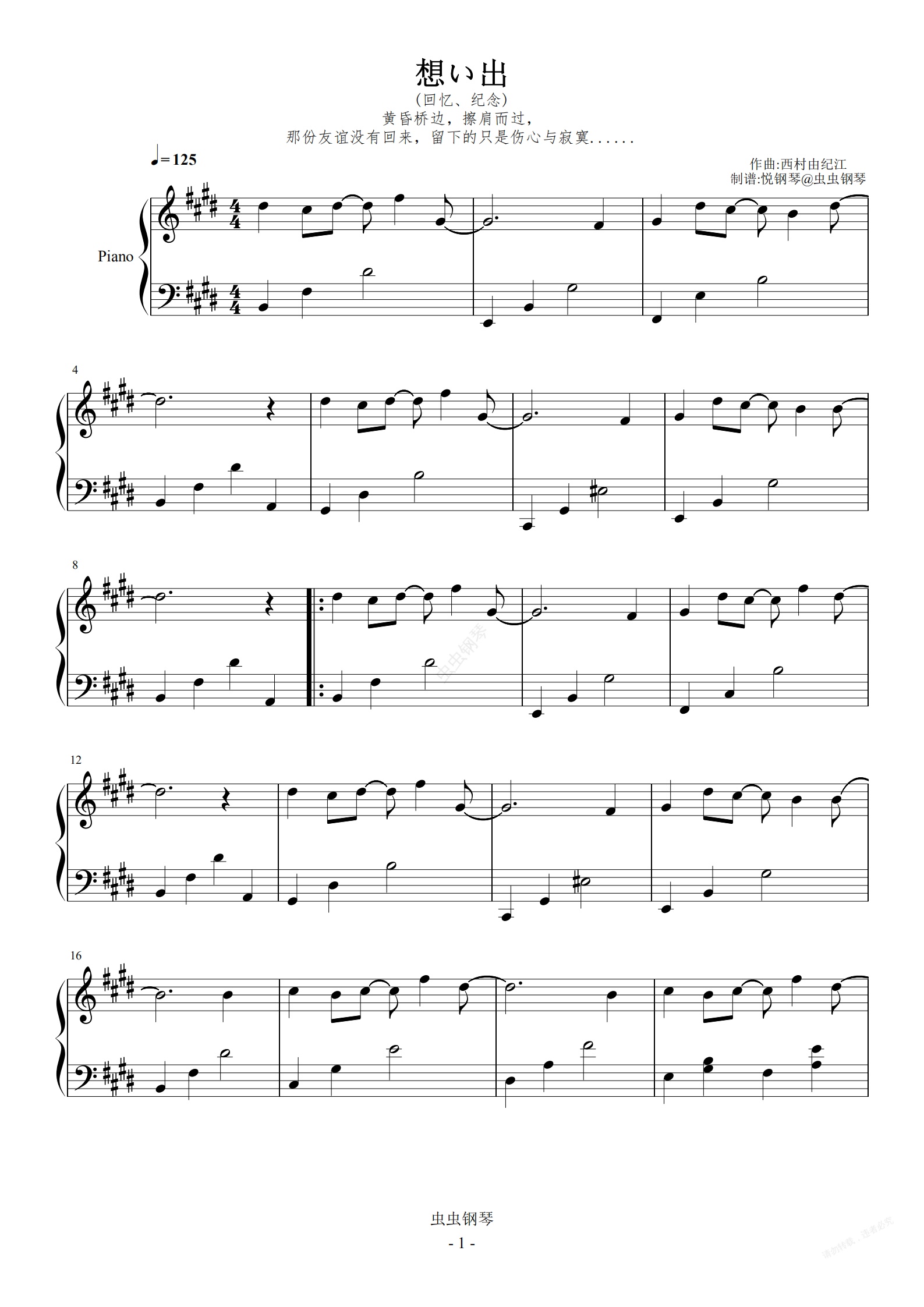 鋼琴譜:想い出(回憶、紀念)官方原版 西村由紀江