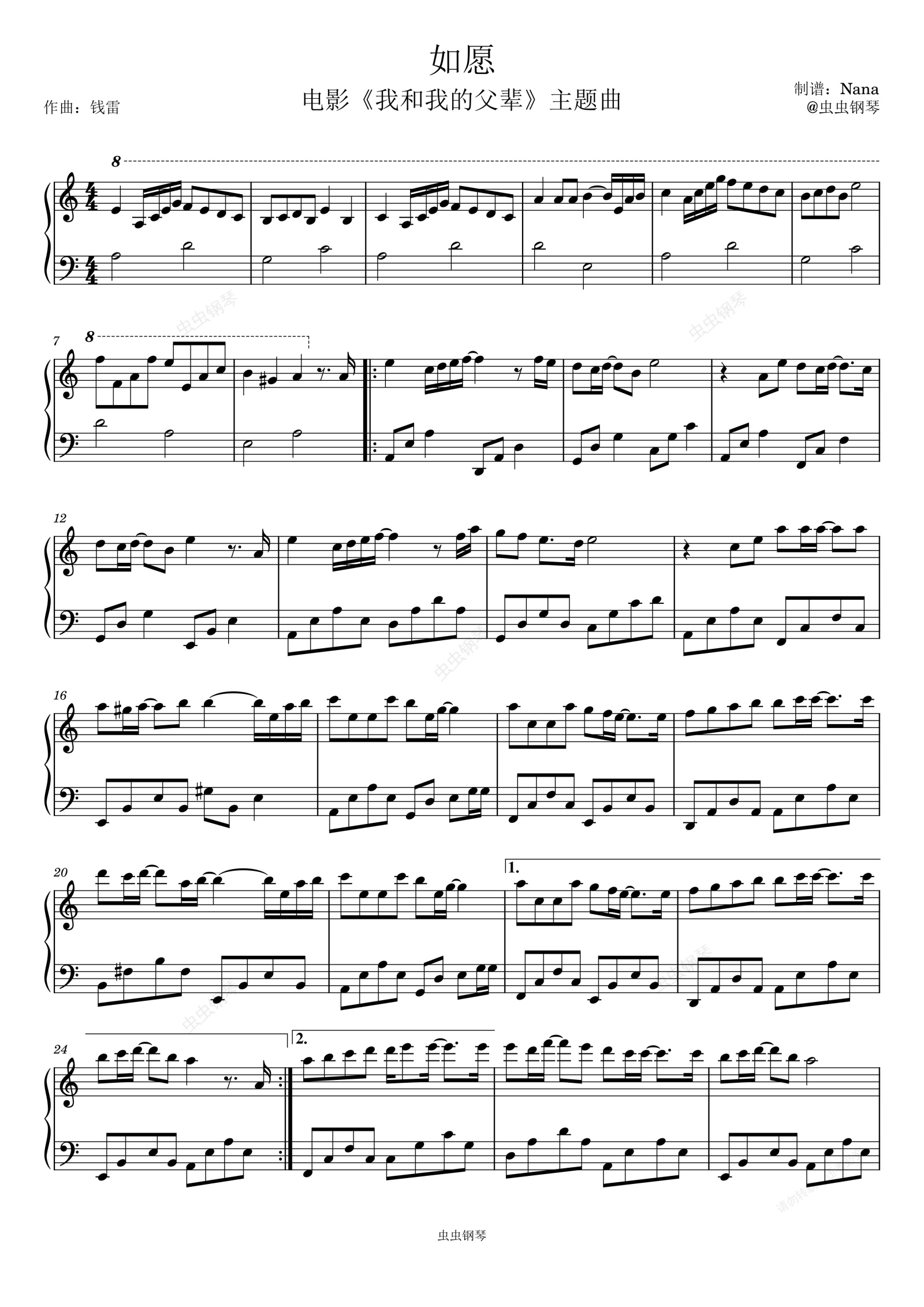 鋼琴譜:如愿C調—我和我的父輩主題曲