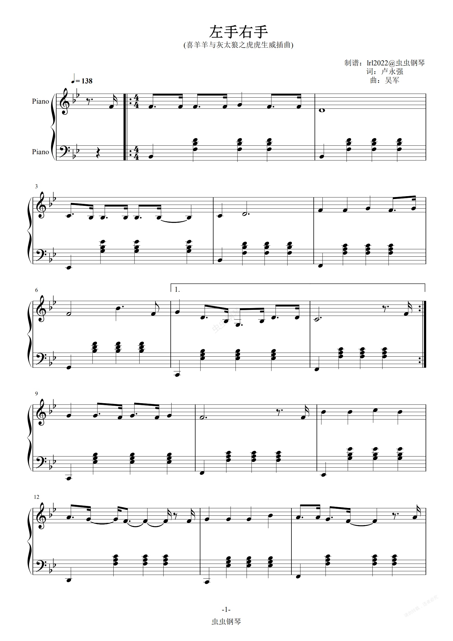 • 左手右手-喜羊羊與灰太狼之虎虎生威插曲-五線譜-獨奏版-鋼琴譜
