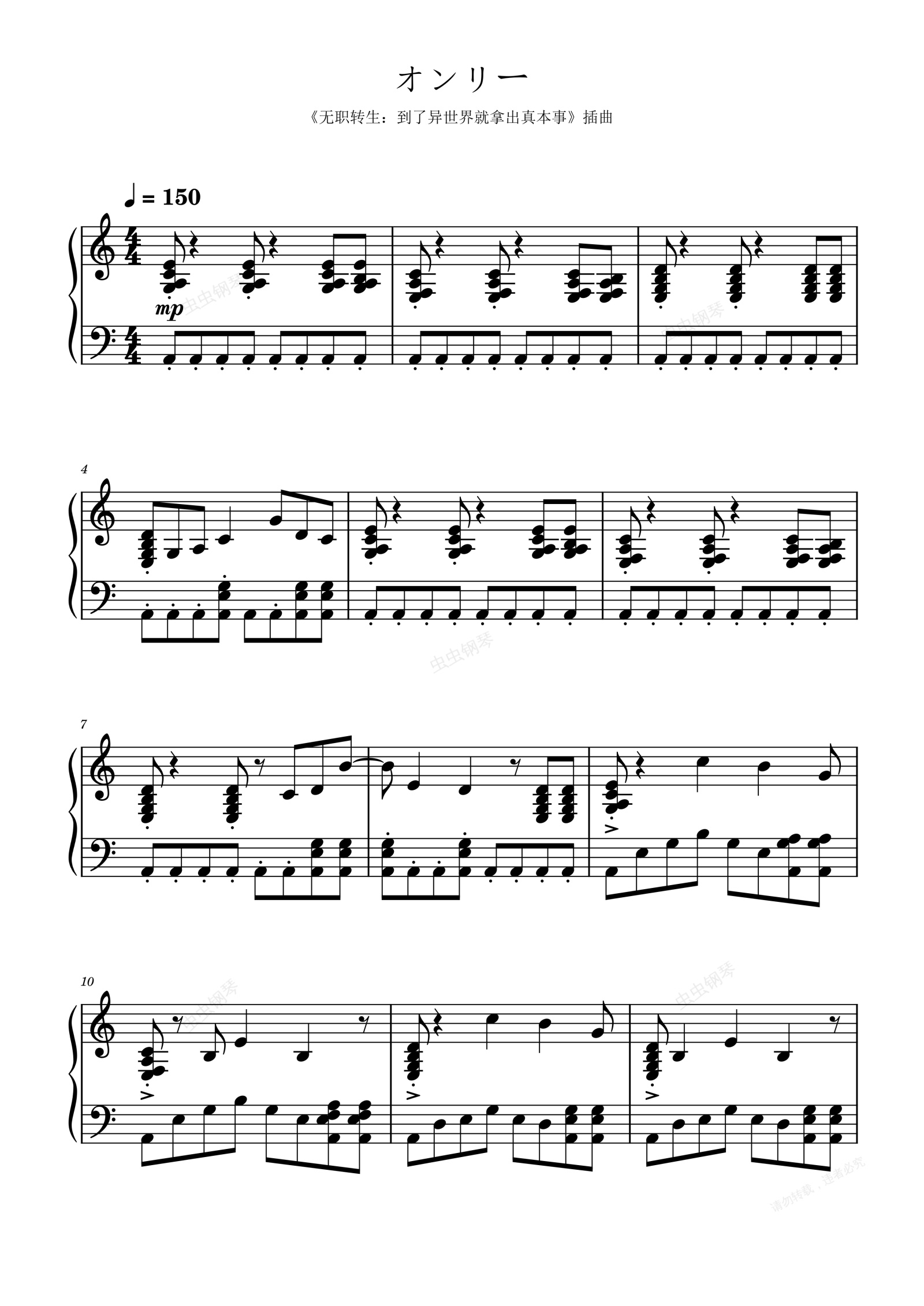 鋼琴譜:オンリー(《無職轉生:到了異世界就拿出真本事》插曲)- 大原ゆい子