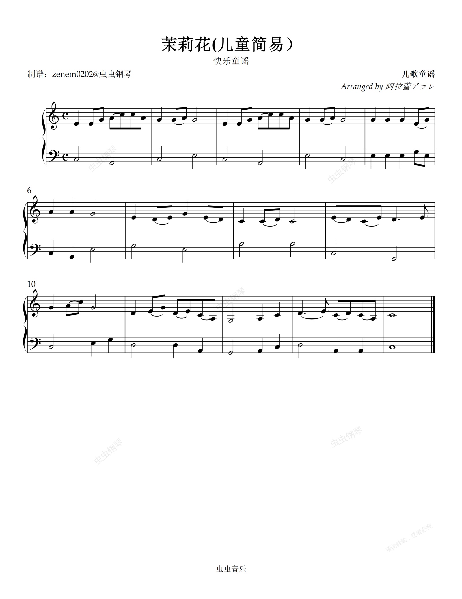 鋼琴譜:茉莉花(兒童簡易)