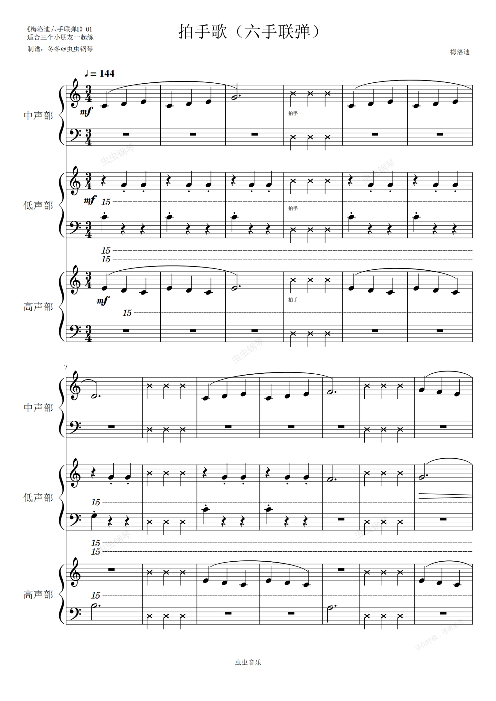 鋼琴譜:拍手歌(六手聯(lián)彈)