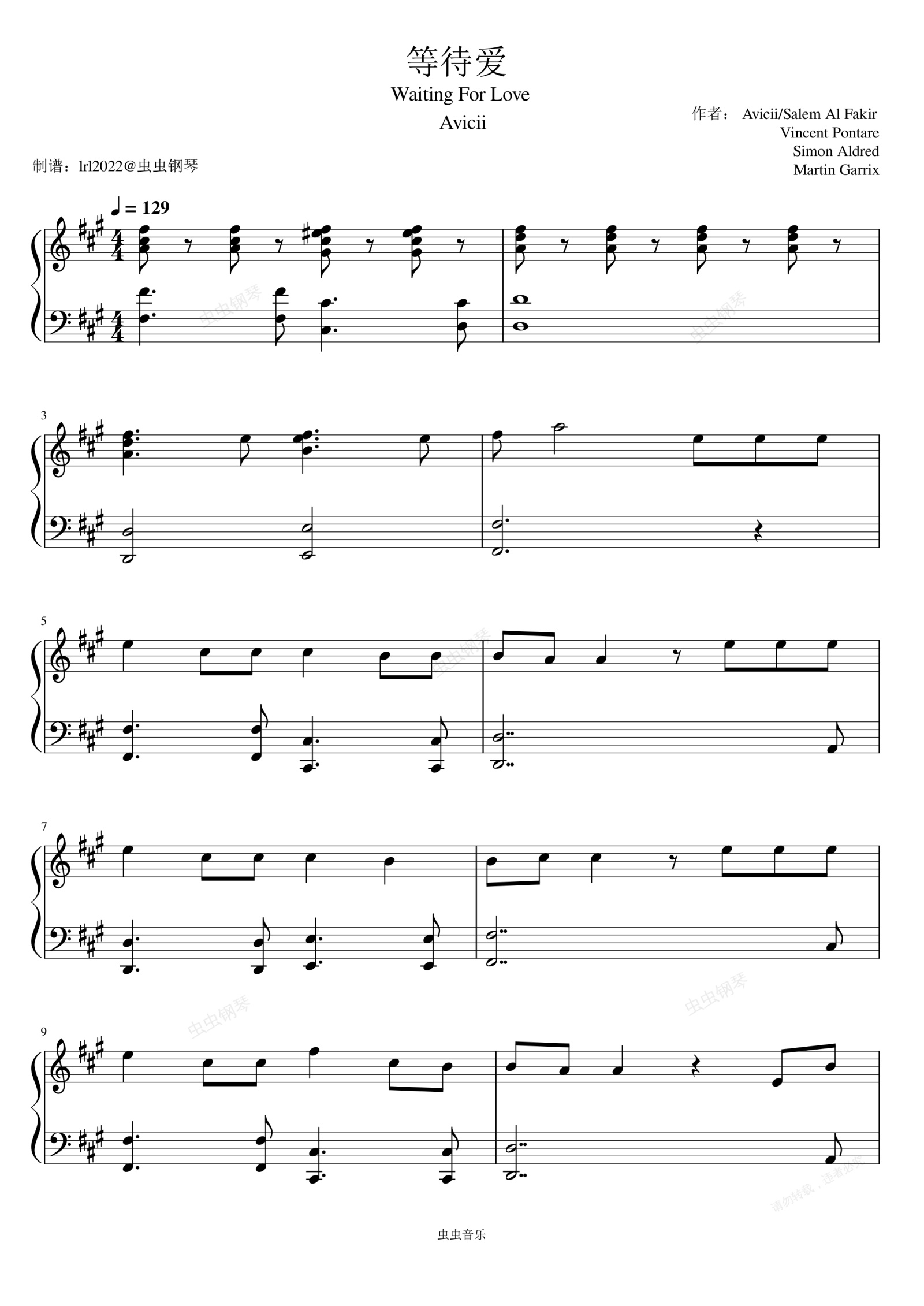 鋼琴譜:Waiting For Love - Avicii -《等待愛》 - 鋼琴獨奏
