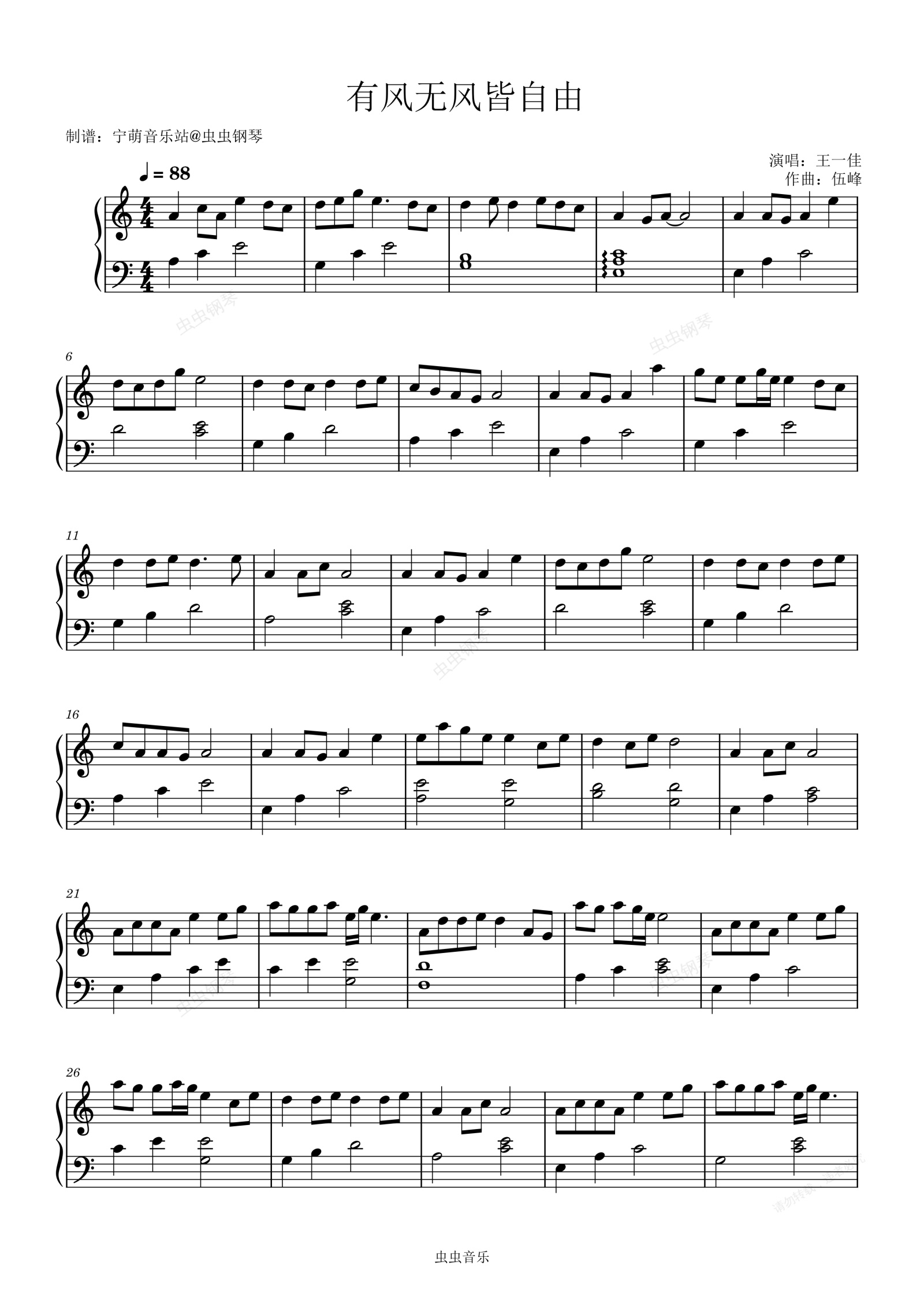 鋼琴譜:有風無風皆自由 C調超簡單初學者