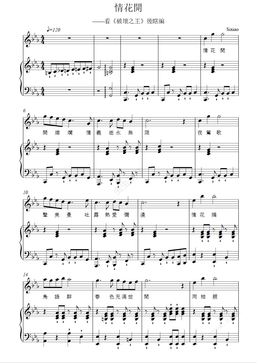 又把周星馳的《破壞之王》看了一遍,實在笑得不行了,特別是中間鐘麗緹與大師兄唱歌那段,那么一本正經的去搞笑!覺得這首《情花開》蠻好玩,所以編了這個小曲子,電影里沒有完整的歌曲,最后的小尾聲是我自己加的。