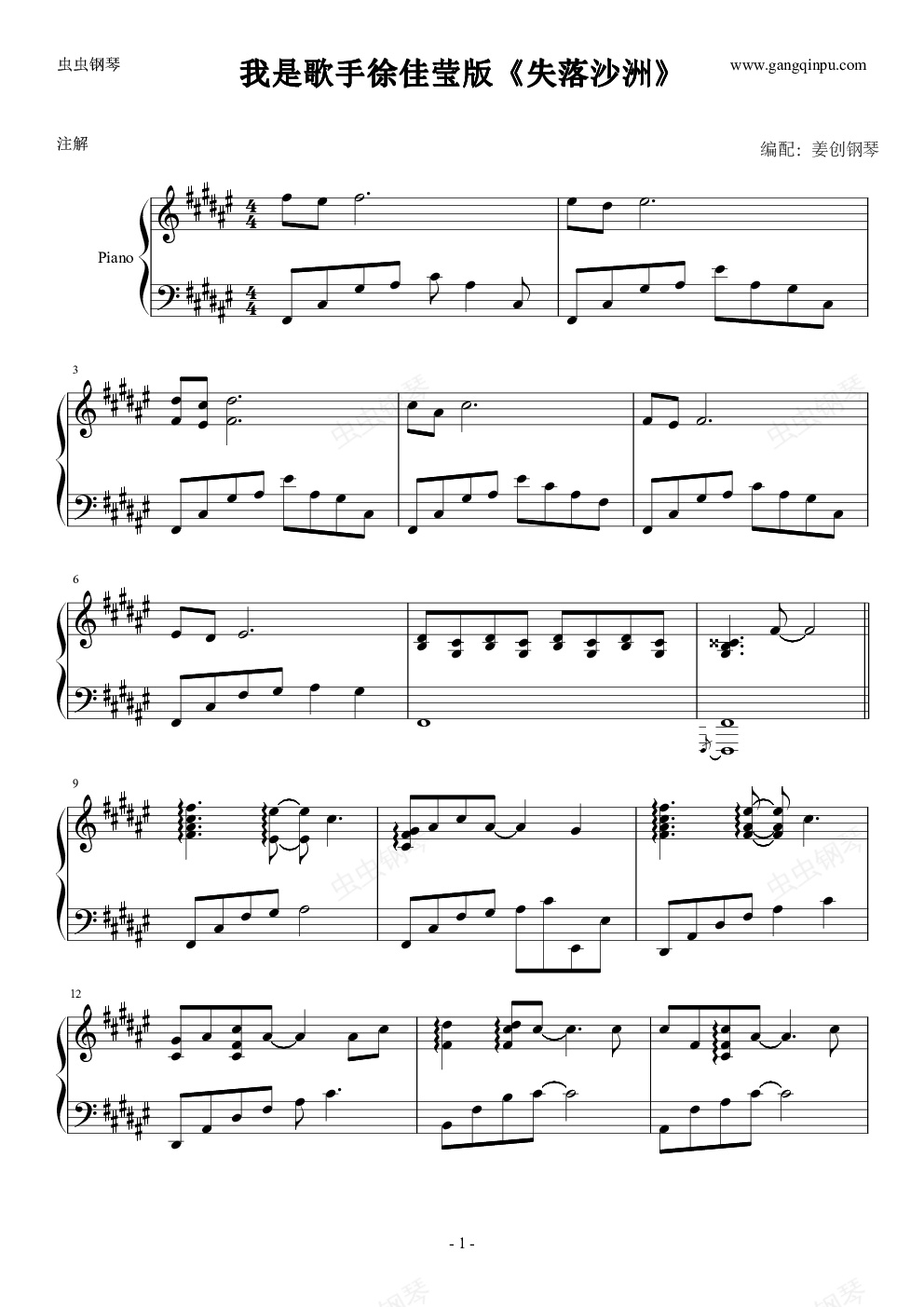 鋼琴譜:《失落沙洲》鋼琴譜-我是歌手版