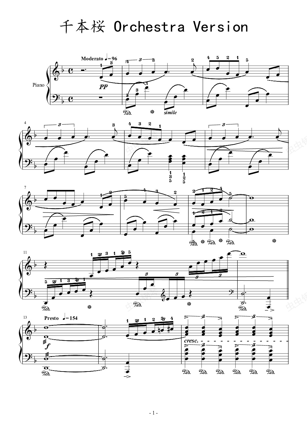 千本櫻(せんぼんざくら)是 P于2011年9月17日投稿至動畫的單曲作品,初音未來的代表曲目之一,歌曲以昭和時(shí)代為背景,歌頌了大正時(shí)代的日本的清新風(fēng)氣與大正天皇的嚴(yán)明,并有 P原作,一斗Maru繪畫的同名小說出版以及石見翔子的同名漫畫。千本櫻傳入中國市場時(shí)已經(jīng)在日本流行幾周;清新、史詩、共榮、櫻花、純潔等詞語差不多可以成為這首歌曲的專用代名詞,而在中國,這首歌曲幾乎都會在各大漫展上出現(xiàn)過,尤其是2011年9月后半旬至后三年這段歌曲紅遍全球的黃金時(shí)間,幾乎人人都在談?wù)摯饲?。本曲曾獲得“向世界夸贊的日本名曲100首”獎項(xiàng),獲得了第25名的好成績,其節(jié)目在東京電視臺放送過,人氣更是達(dá)到了頂峰。該歌曲已經(jīng)于2018年3月7日有日本某音樂人改編為交響樂版本,并收錄在初音未來的交響樂專輯中。大膽不敵に ハイカラ革命 大膽無畏,洋化革命磊々落々 反戦國家 光明磊落,反戰(zhàn)國家日の丸印の 二輪車転がし 騎著日之丸印的,二輪車悪霊退散 ICBM 惡靈退散,ICBM環(huán)狀線を走り抜けて 東奔西走なんのその 奔馳穿過環(huán)狀線,東奔西走不算什么少年少女戦國無雙 浮世の隨に 少年少女戰(zhàn)國無雙,跟從著浮世浪千本桜 夜に紛れ 君の聲も屆かないよ 千本櫻溶入夜中,連你的聲音也傳不到啊此処は宴 鋼の檻 その斷頭臺で見下ろして 此處開宴鋼鐵牢籠中,自那斷頭臺上往下看吧三千世界 常世之闇 嘆く唄も聞こえないよ 三千世界黃泉之暗,連哀嘆之歌也聽不見青藍(lán)の空 遙か彼方 その光線銃で 打ち抜いて 青藍(lán)天空遙遠(yuǎn)彼端,就用那光線槍射穿吧百戦錬磨の見た目は將校 看來身經(jīng)百戰(zhàn)實(shí)為將校いったりきたりの花魁道中 人潮來往的花魁道中あいつもこいつも皆で集まれ 不管那個(gè)人或這個(gè)人大家都過來吧聖者の行進(jìn) わんっ つー さん しっ 圣者的行進(jìn)一二三四禪定門を潛り抜けて 安楽浄土厄払い 穿過出家僧人旁,安樂凈土驅(qū)兇避邪きっと終幕は大団円 拍手の合間に 最后一幕一定就是大團(tuán)圓,在掌聲的同時(shí)千本桜 夜に紛れ 君の聲も屆かないよ 千本櫻溶入夜中,連你的聲音也傳不到啊此処は宴 鋼の檻 その斷頭臺で見下ろして 此處開宴鋼鐵牢籠中,自那斷頭臺上往下看吧三千世界 常世之闇 嘆く唄も聞こえないよ 三千世界黃泉之暗,連哀嘆之歌也聽不見啊希望の丘 遙か彼方 その閃光弾を打ち上げろ 希望之丘遙遠(yuǎn)彼端,就將那閃光彈射入天吧環(huán)狀線を走り抜けて 東奔西走なんのその 奔馳穿過環(huán)狀線,東奔西走不算什么少年少女戦國無雙 浮世の隨に 少年少女戰(zhàn)國無雙,跟從著浮世浪千本桜 夜に紛れ 君の聲も屆かないよ 千本櫻溶入夜中,連你的聲音也傳不到啊此処は宴 鋼の檻 その斷頭臺で見下ろして 此處開宴鋼鐵牢籠中,自那斷頭臺上往下看吧千本桜 夜に紛れ 君が歌い僕は踴る 千本櫻溶入夜中,你歌我舞此処は宴 鋼の檻 さあ光線銃を撃ちまくれ~~~~~~~~~~ 此處開宴鋼鐵牢籠中,扣下光線槍的扳機(jī)吧~~~~~~~~~~這首名曲在未來一定會廣為流傳。
