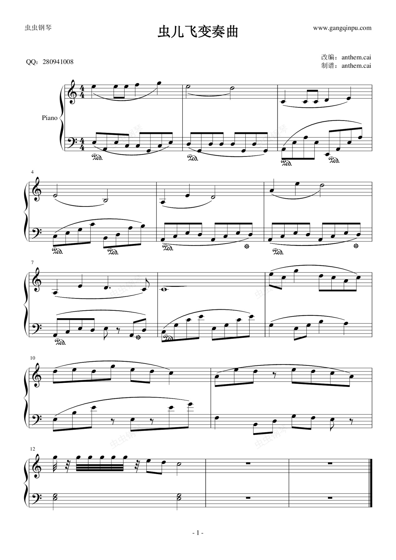 鋼琴譜:蟲兒飛(變調,改奏)