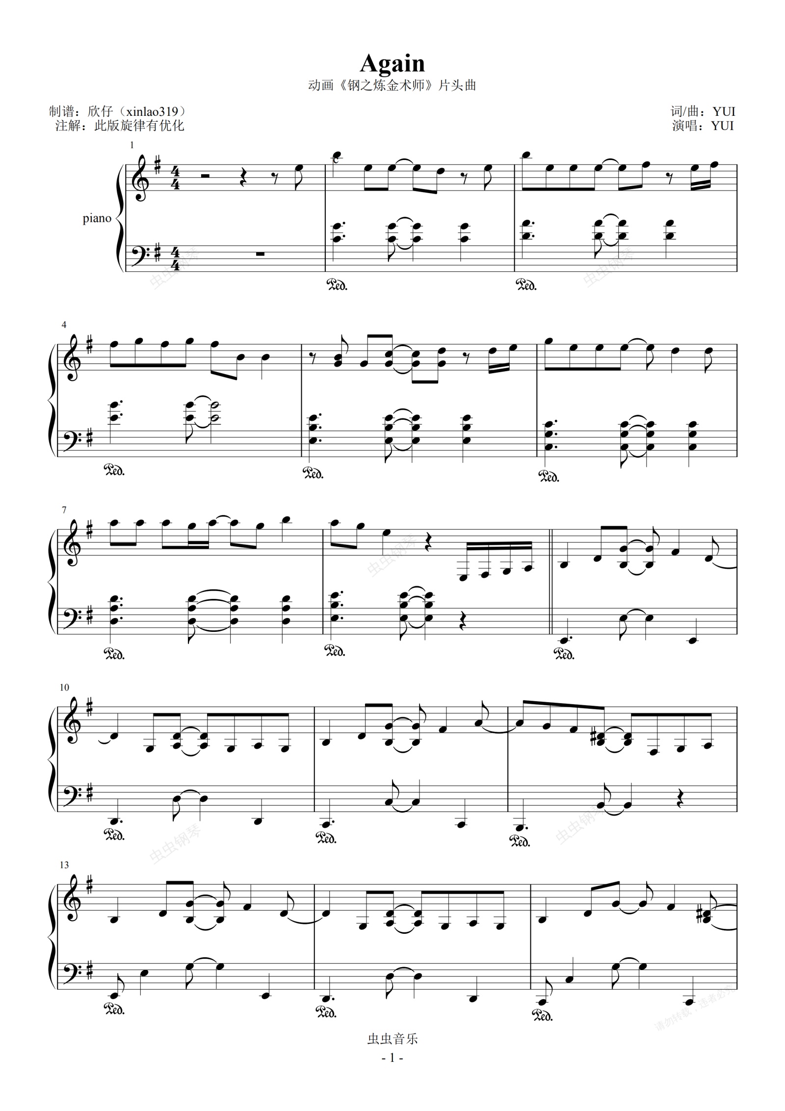 鋼琴譜:Again《鋼之煉金術師》片頭曲(新編優化版)
