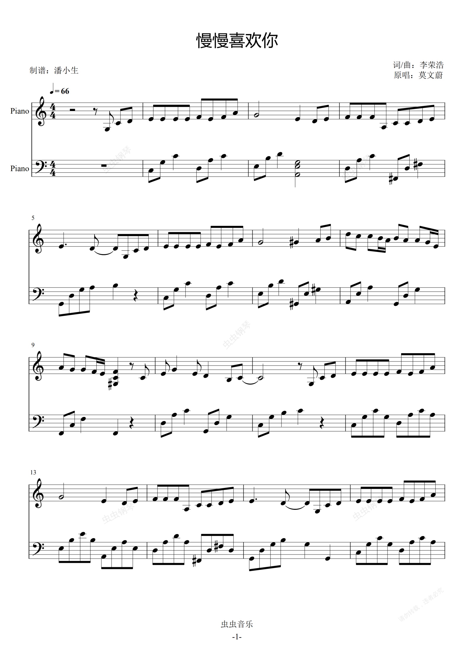 慢慢喜歡你 C大調(diào) 簡化版 獨(dú)奏譜