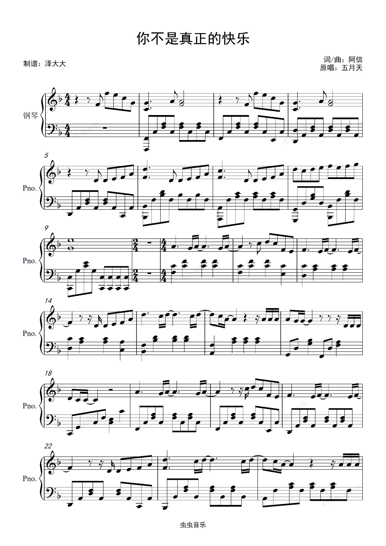 鋼琴譜:你不是真正的快樂(完美獨奏版)