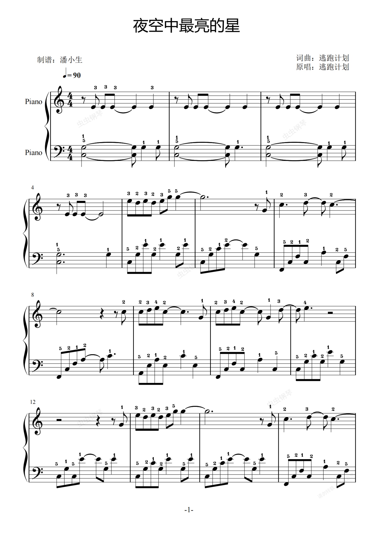 鋼琴譜:夜空中最亮的星 完整指法 C調 初學者優選