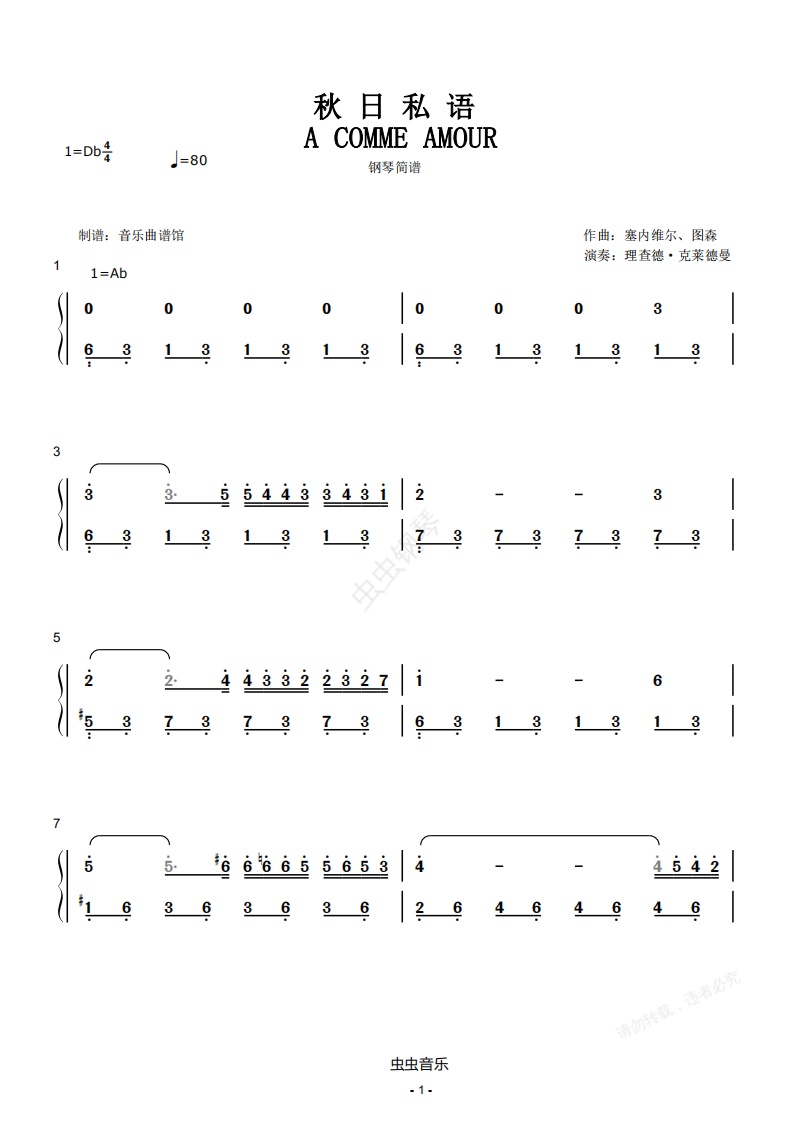 鋼琴譜:秋日的私語(yǔ)-【簡(jiǎn)譜】(秋的喁語(yǔ) A COMME AMOUR 美好的戀情 理查德克萊德曼)