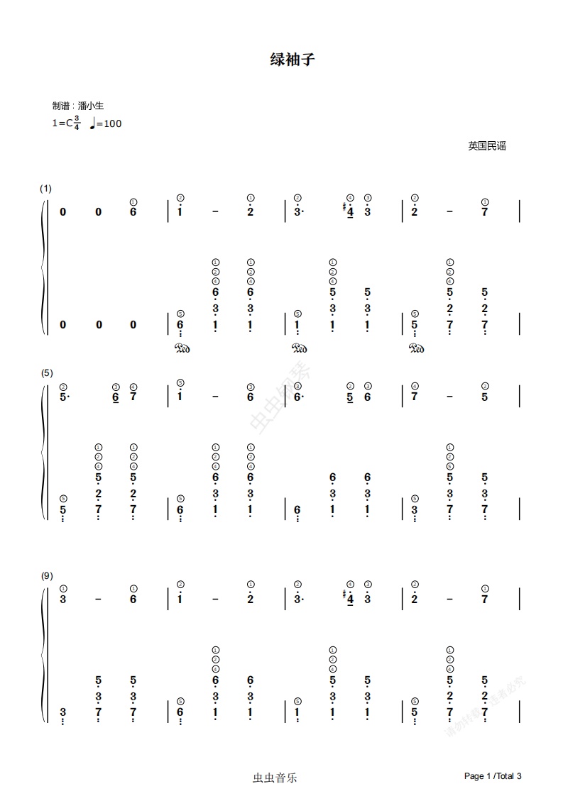 鋼琴譜:[雙手簡譜] 綠袖子 帶指法 C調