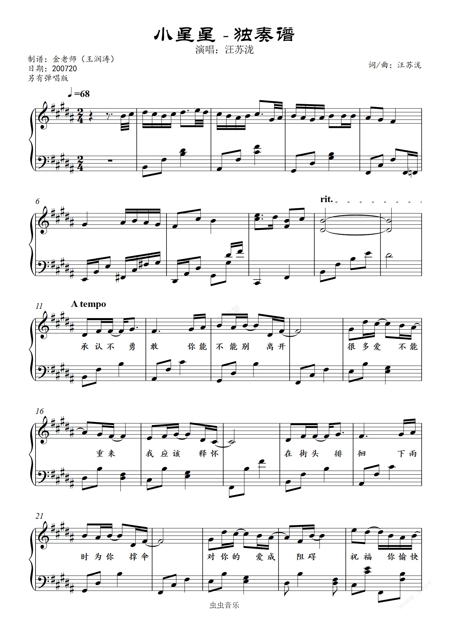 鋼琴譜:小星星(汪蘇瀧)-金老師獨(dú)奏譜