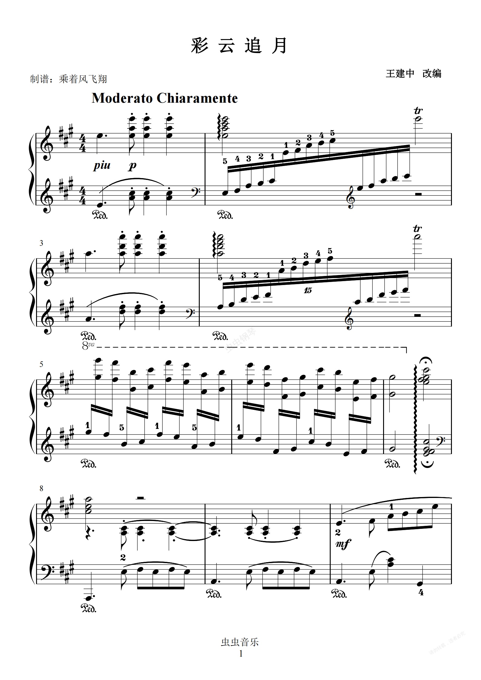 《彩云追月》是由任光、聶耳于1935年創作的優秀的民族管弦樂曲。鋼琴作曲家王建中成功地把它與鋼琴特有的表現手法融為一體,改編成鋼琴曲,作品以濃郁的民族色彩與獨具特色的藝術感染力而深受人們的喜愛,成為各藝術院校鋼琴學生必彈的曲目。《彩云追月》的旋律,采用中國的五聲音階寫成,簡單、質樸,線條流暢,優美抒情,形象地描繪了浩瀚夜空的迷人景色。