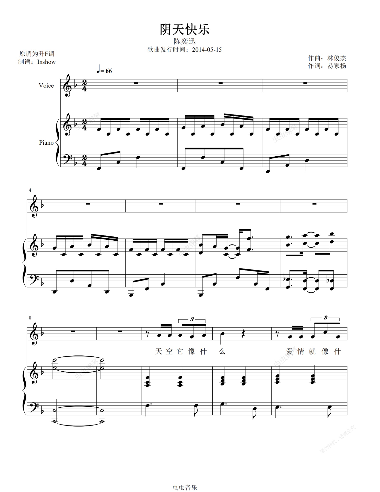鋼琴譜:陳奕迅 - 陰天快樂【F調彈唱譜】