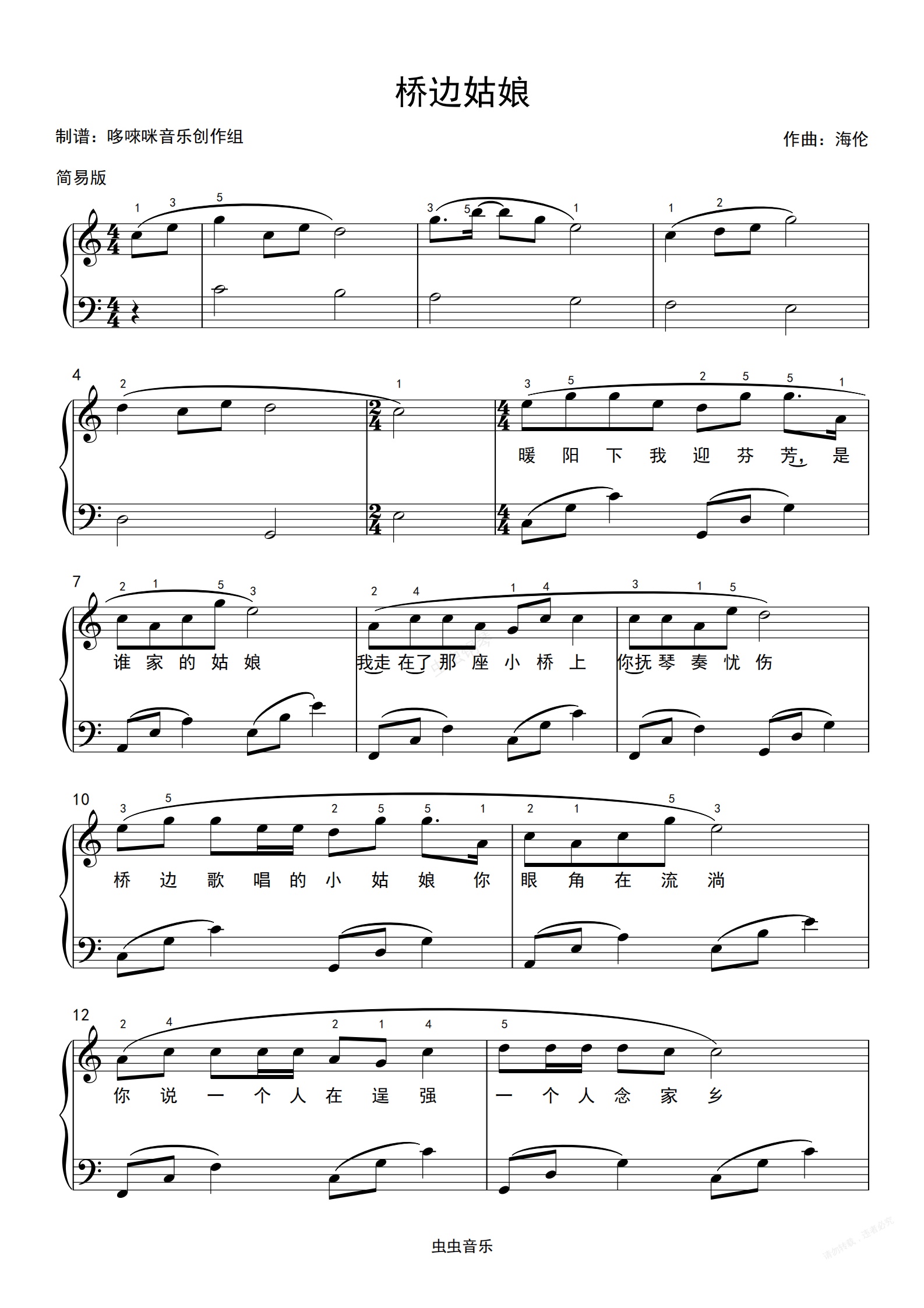 鋼琴譜:橋邊姑娘 簡易版 拜厄程度