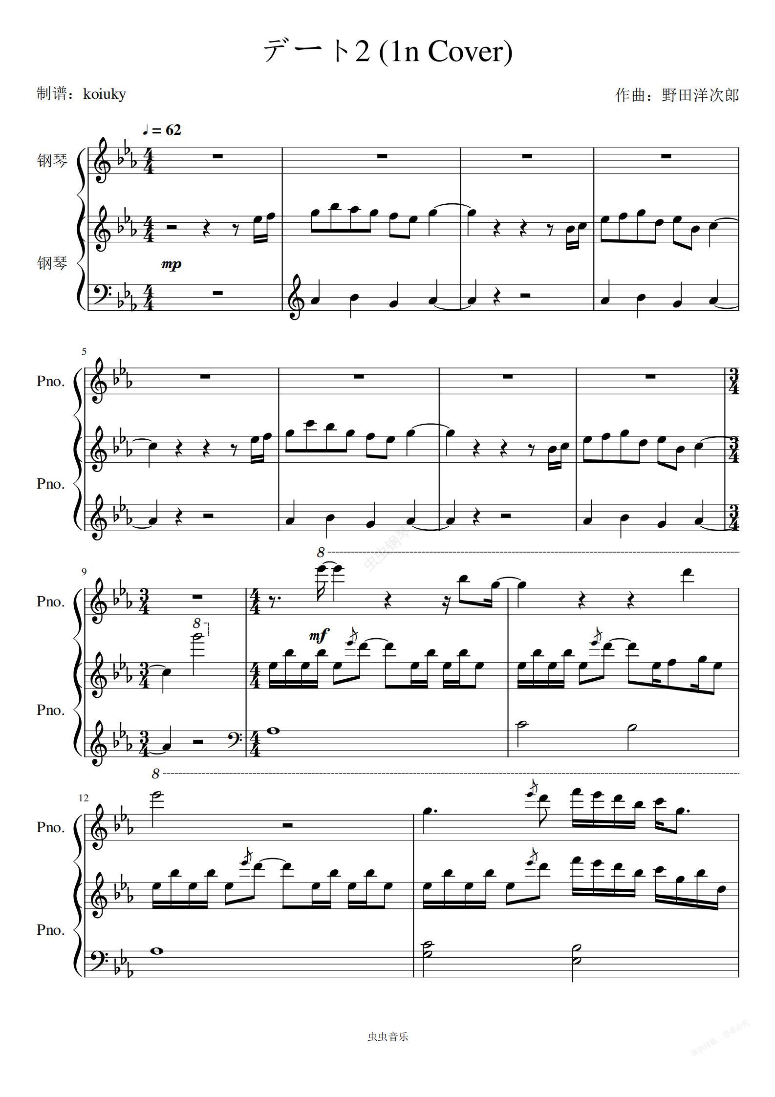 鋼琴譜:你的名字 - デート2 (1n Cover) 三軌完整還原鋼琴譜