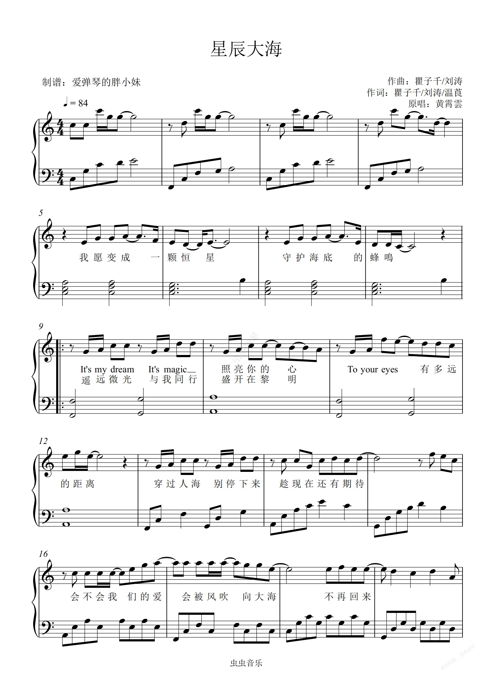 鋼琴譜:星辰大海-黃霄雲-C調初學者簡單版