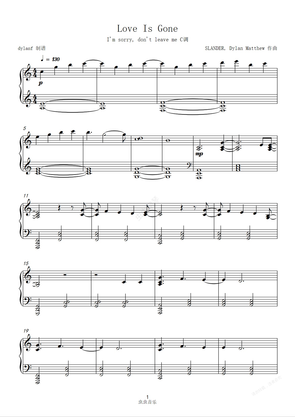 鋼琴譜:C調易彈《Love Is Gone》Slander