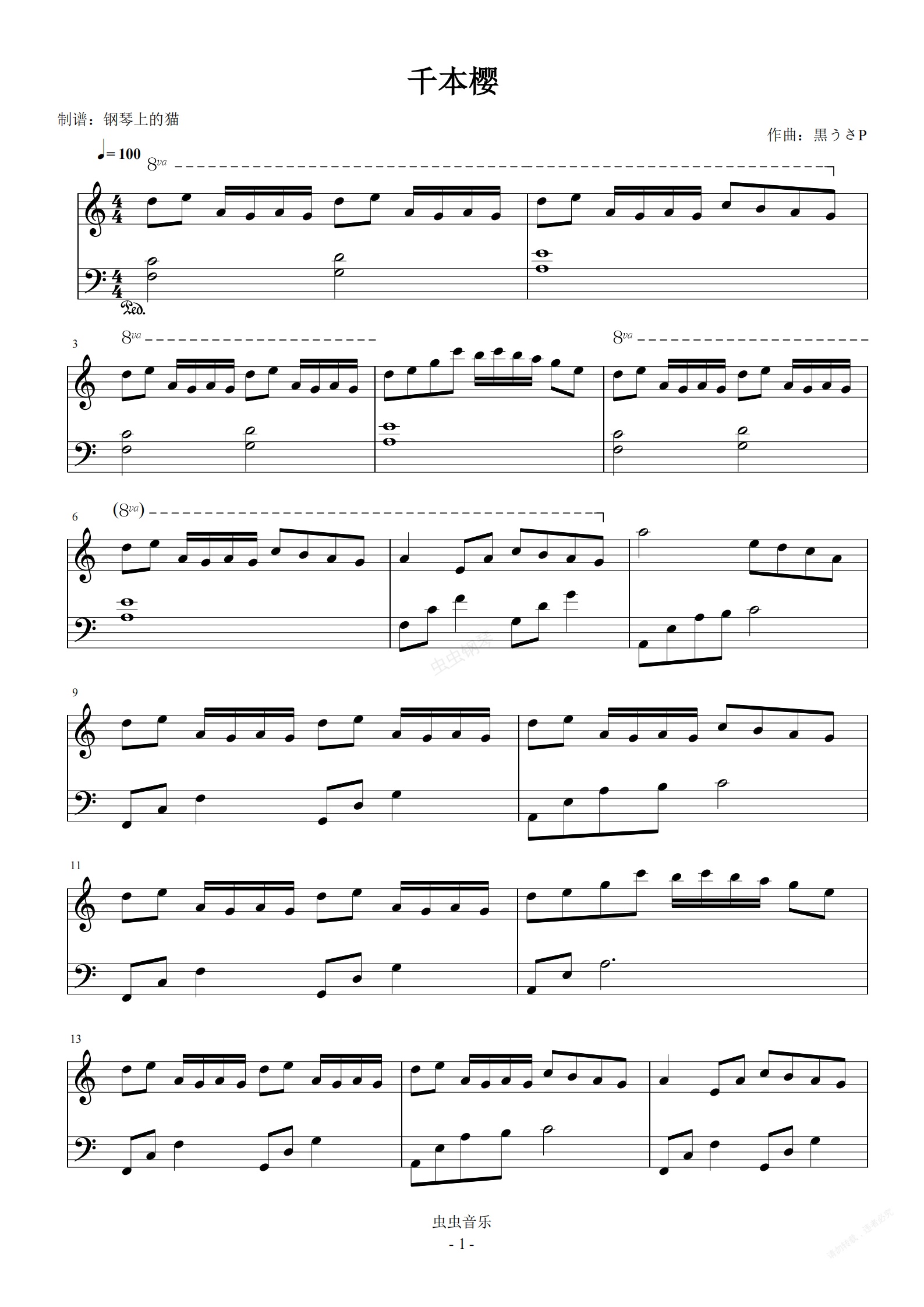 鋼琴譜:千本櫻(千本桜)C調簡易版