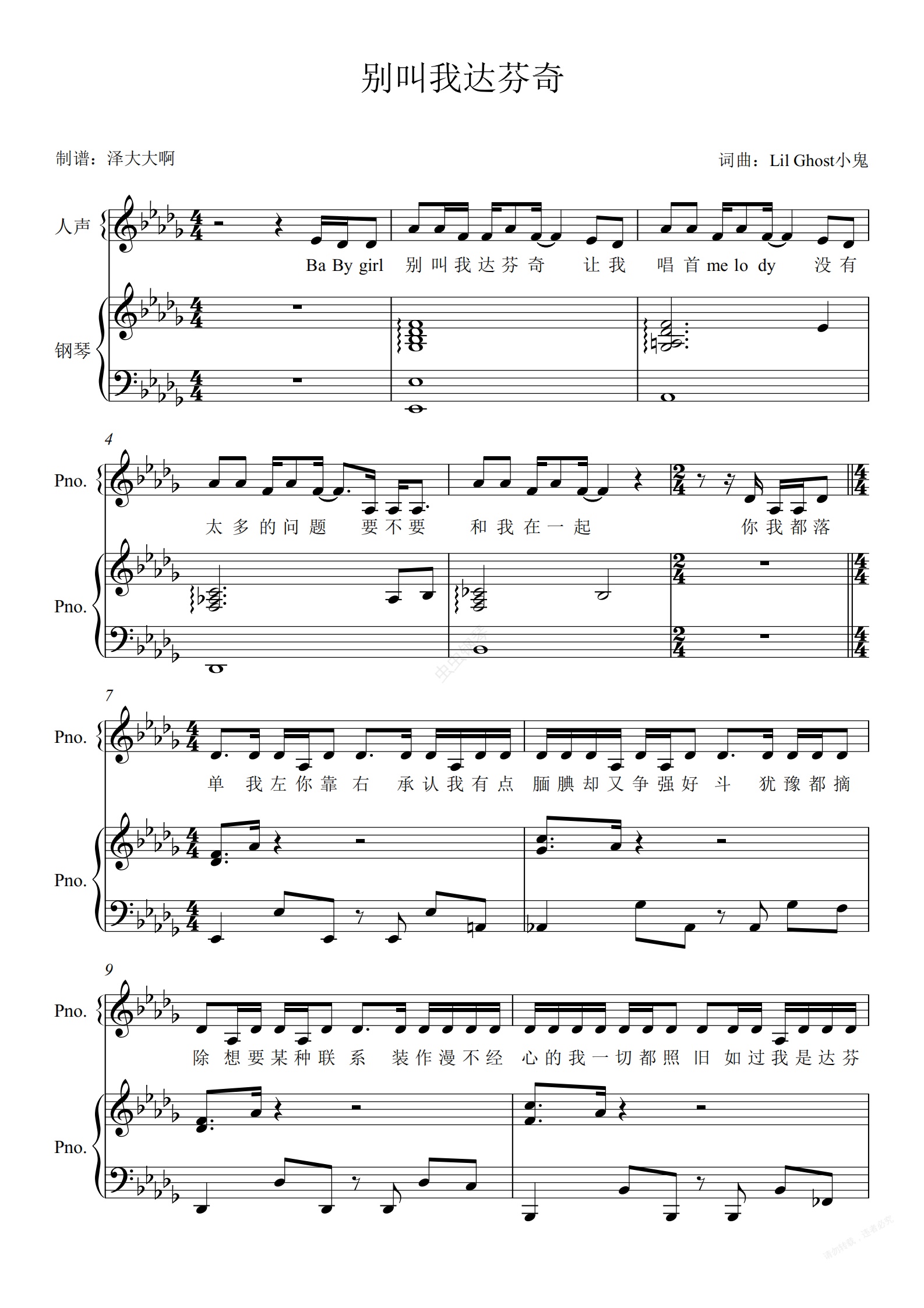 鋼琴譜:別叫我達芬奇【精編彈唱附詞】澤大大 Lil Ghost小鬼