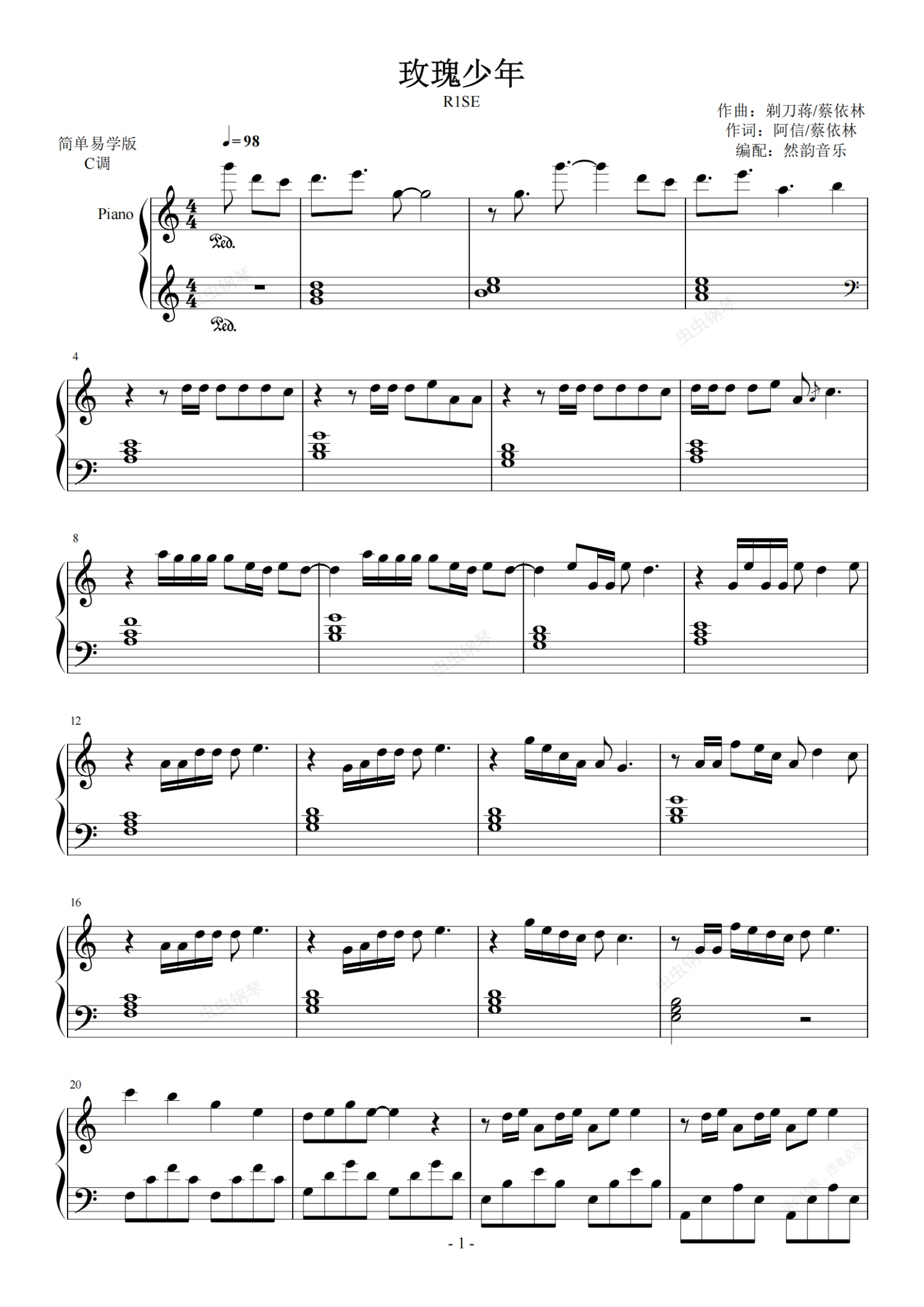 鋼琴譜:【C調(diào)】R1SE-玫瑰少年 簡(jiǎn)單易學(xué)版