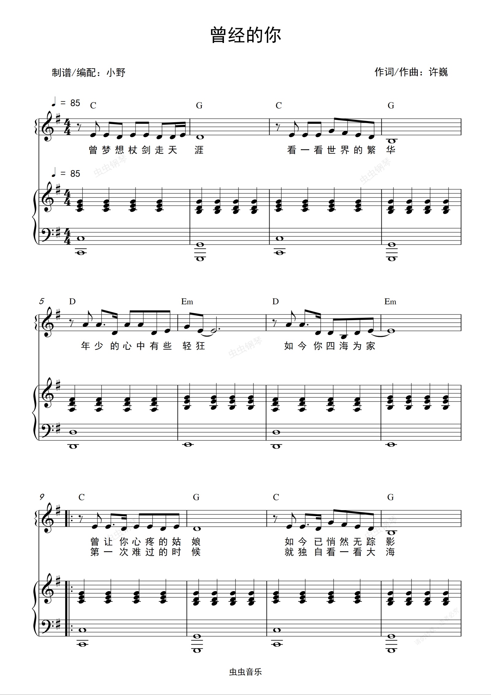 鋼琴譜:曾經的你(e小調和弦彈唱版)
