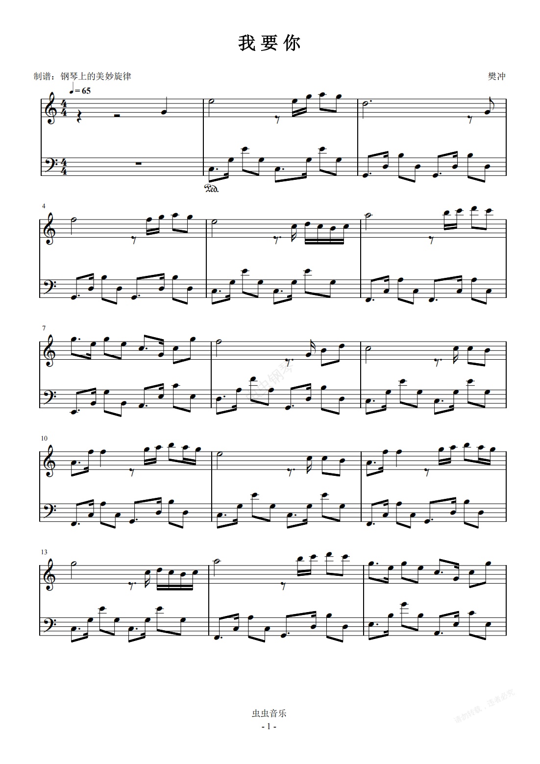 鋼琴譜:我要你 C調(diào)簡(jiǎn)易版 任素汐