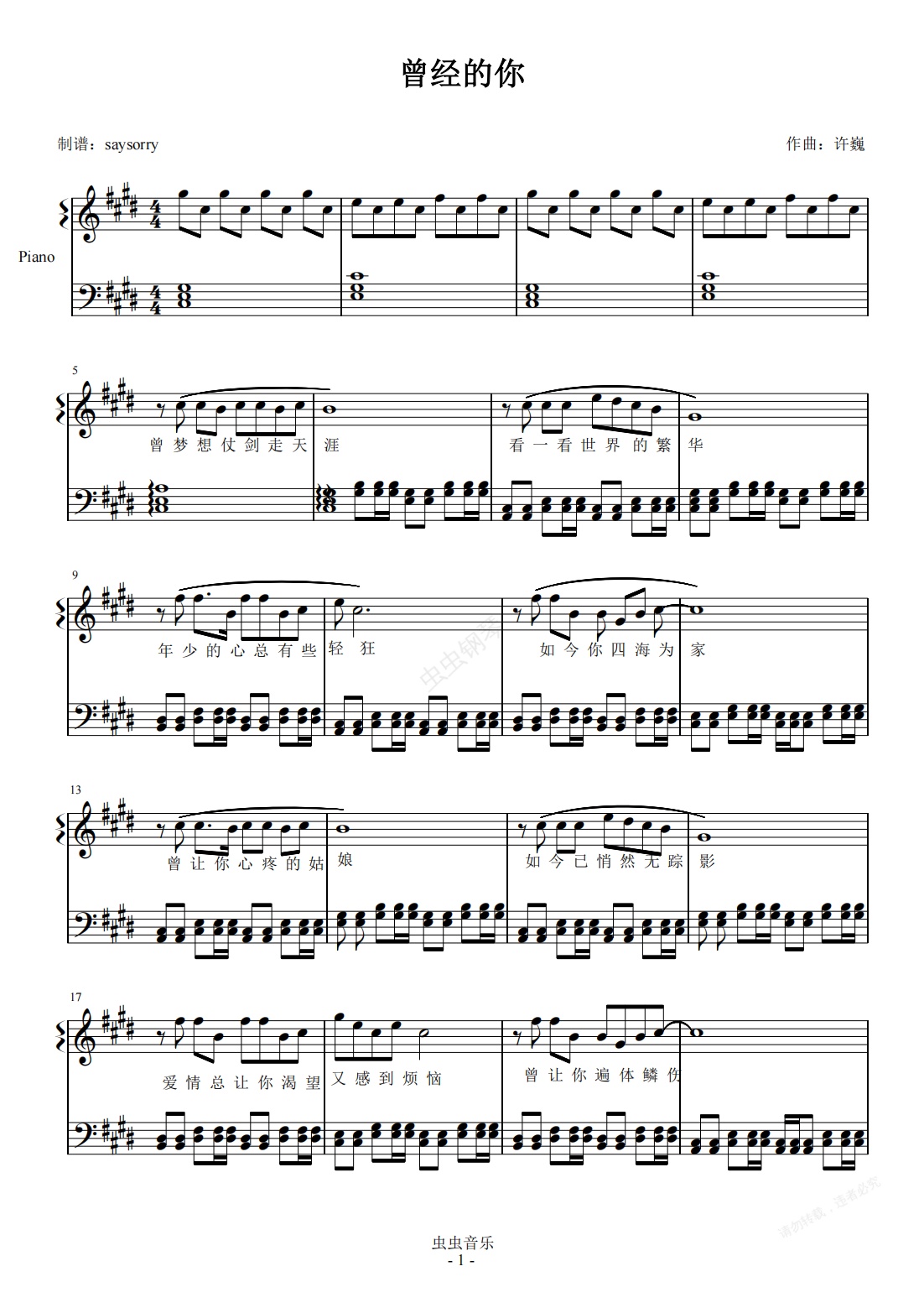 鋼琴譜:《曾經的你》原調鋼琴獨奏版