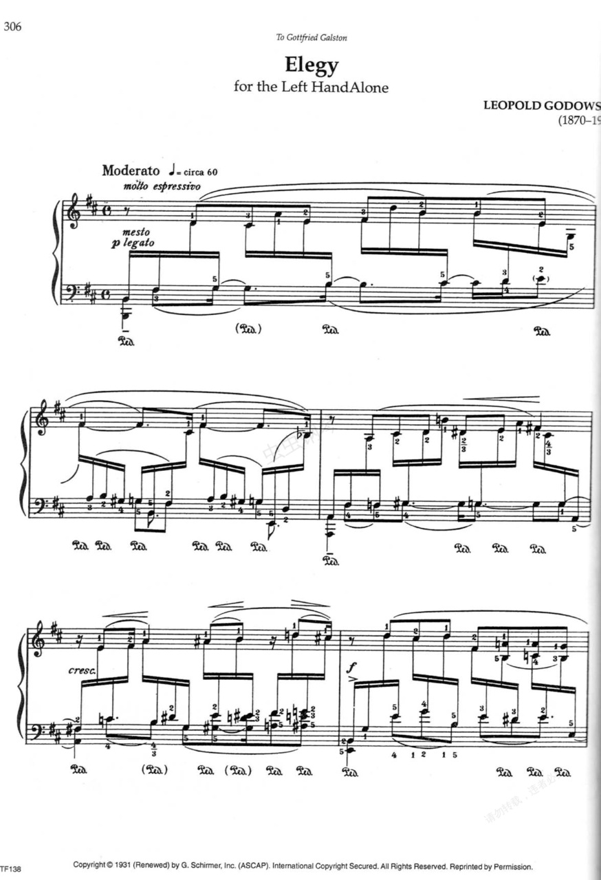 悲歌 Elegy - 為左手獨(dú)奏而作《悲歌》Elegy ,為左手獨(dú)奏而作,作于1929年3月6日,于1931年12月24日出版。b小調(diào),中板,可以看成是由五個(gè)聲部組成的圣詠。憂愁的歌聲在中音區(qū)開始吟詠,帶著嘆息的語調(diào),直至感情的迸發(fā),在最后的一刻又再次陷入深沉,渾厚的音響震撼人心。隨后,這首作品還被改編成雙手演奏版。