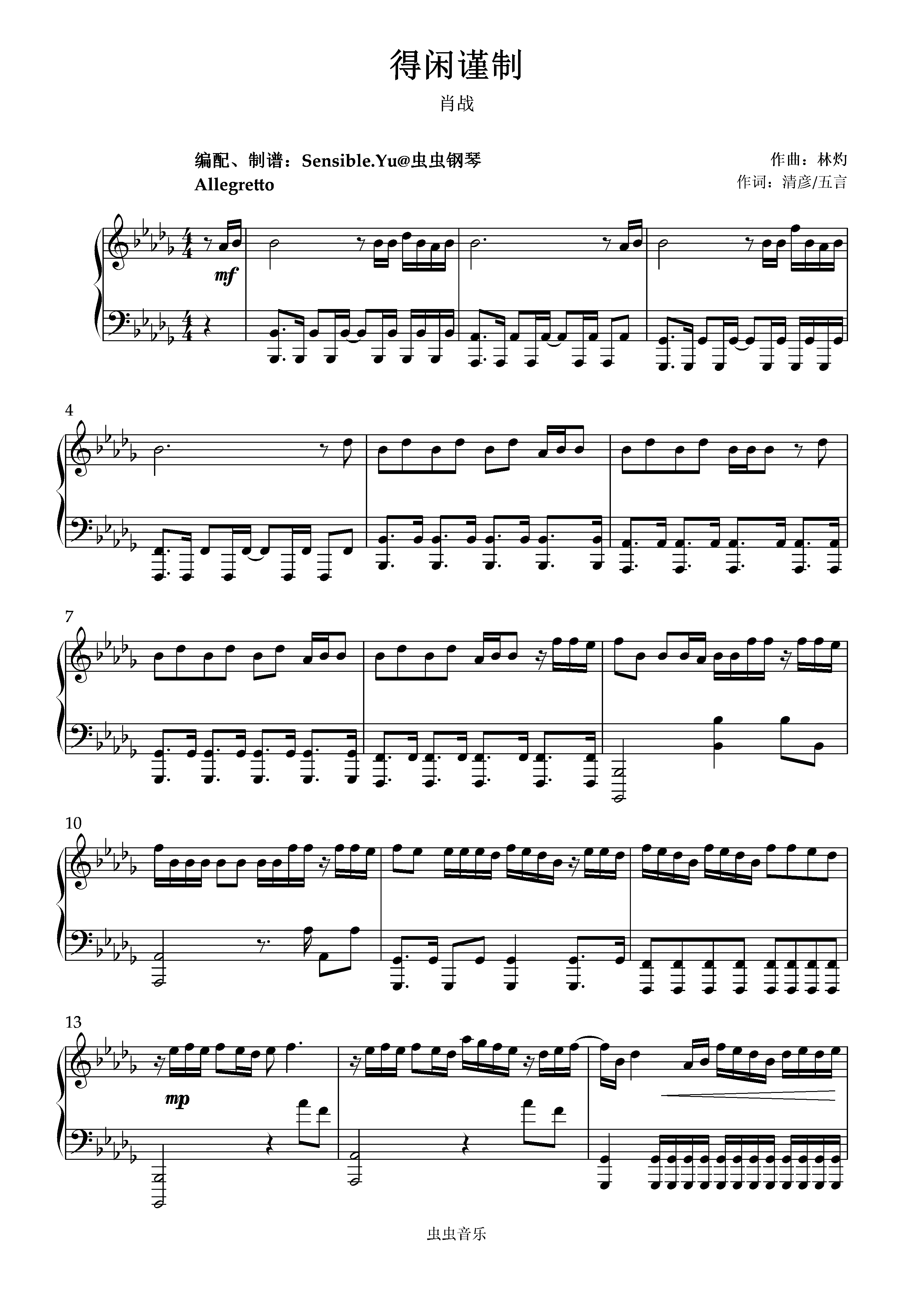 鋼琴譜:《得閑謹(jǐn)制》——肖戰(zhàn)(改編:Sensible.Yu)